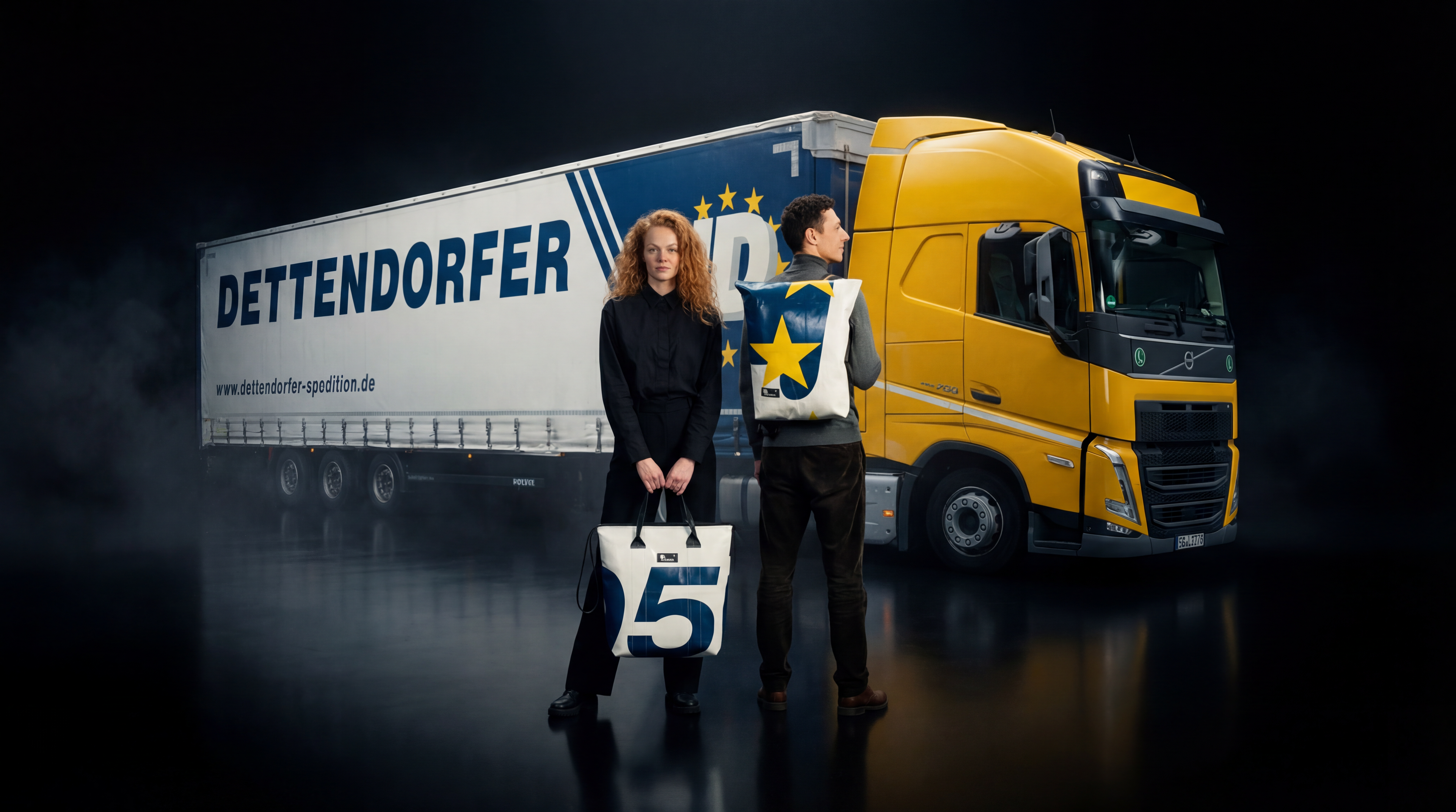 Handgemachter Rolltop Rucksack aus recycelter LKW-Plane