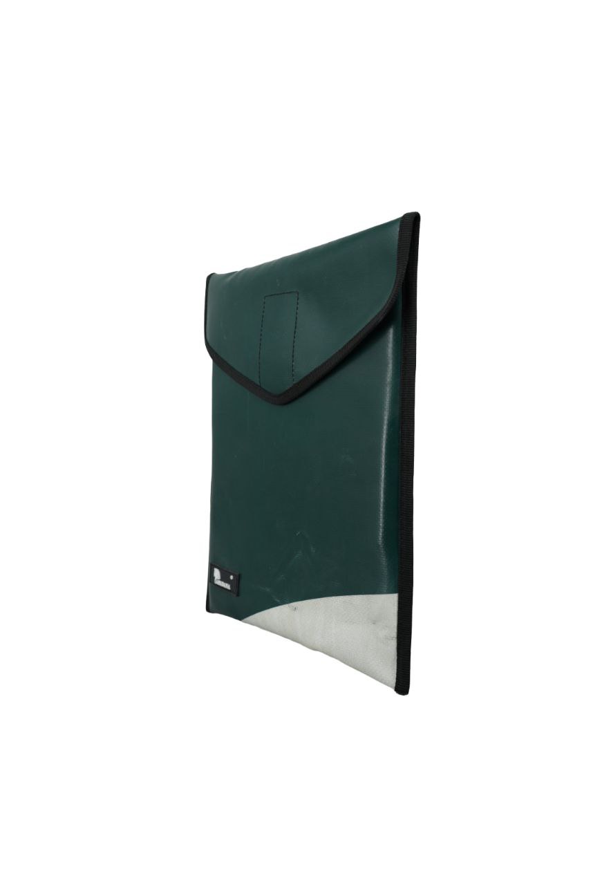 Diese handgefertigte Laptop-Tasche aus recycelter LKW-Plane bietet zuverlässigen Schutz für dein Notebook oder Tablet und überzeugt durch nachhaltiges Design.